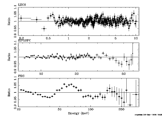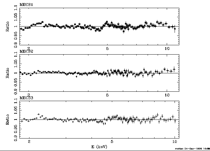 Such matrixes yield less than 5% residuals on the Crab spectrum on the whole band of all NFIs. The figures below show the data/model ratio when a simple absorbed power-law model is applied to the Crab data: